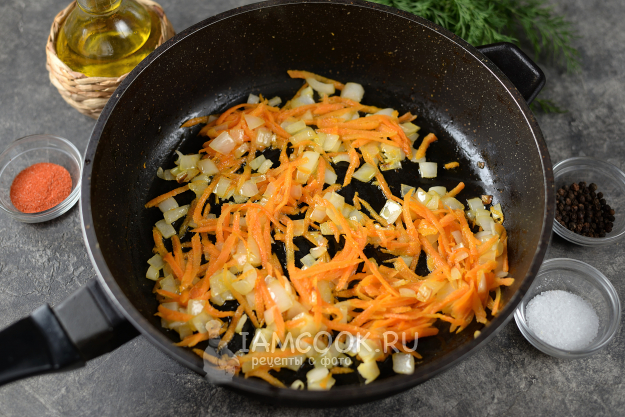 Разогрейте в сковороде рафинированное постное масло, выложите в него нарезанный репчатый лук и натертую на крупной терке морковь. Обжарьте овощи на тихом огне минуты 3-4, они должны стать мягкими.