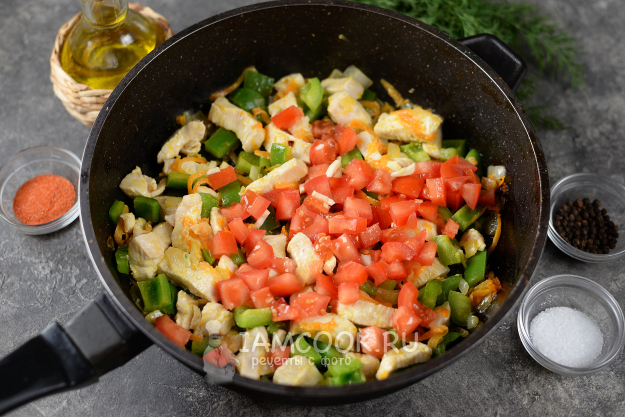 На помидоре вырежьте место плодоножки, нарежьте мелким кубиком, переложите в сковороду.