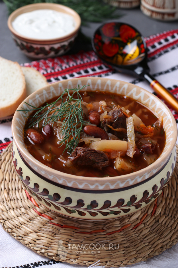 Разлить борщ с говядиной и фасолью по тарелкам, подать к нему сметану.