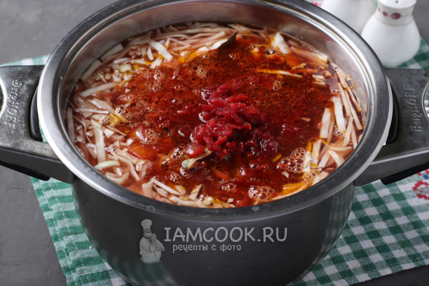 В 300 мл горячей воды разбавить томатную пасту или кетчуп, добавить к овощам. Посолить, добавить лавровый лист и перец горошком. Тушить под крышкой 10 минут.