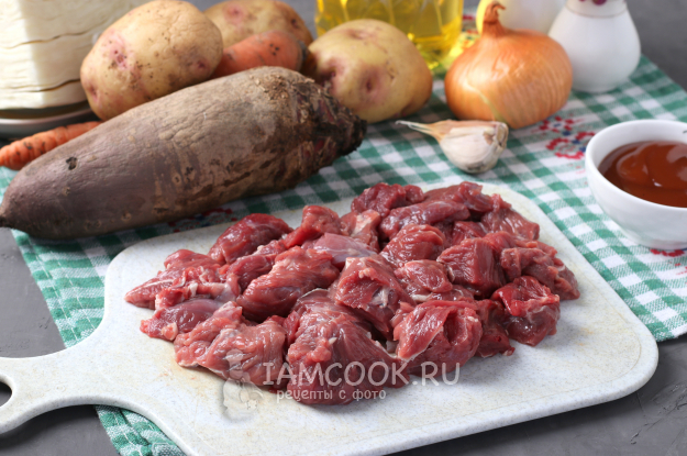 Вымыть проточной водой мясо, нарезать кусочками. Для борща можно использовать мясо на кости, тогда борщ будет более наваристым.