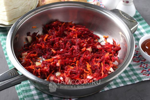 Пока мясо с фасолью варятся, приготовить зажарку. Почистить лук, морковь и свеклу. Лук нарезать кубиками, а морковь и свеклу натереть на тёрке.