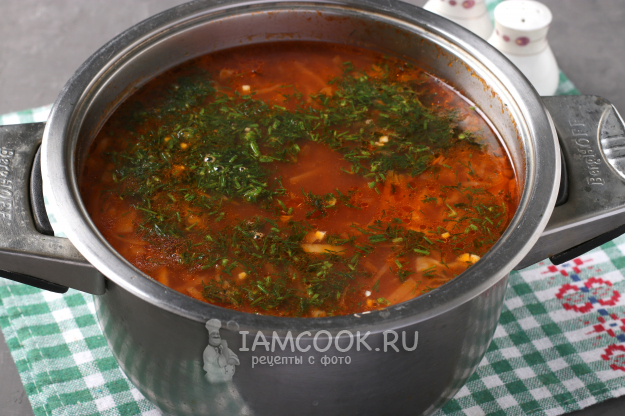 В самом конце добавить измельчённый укроп и чеснок. Борщ накрыть крышкой и дать настояться.