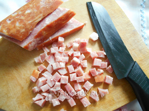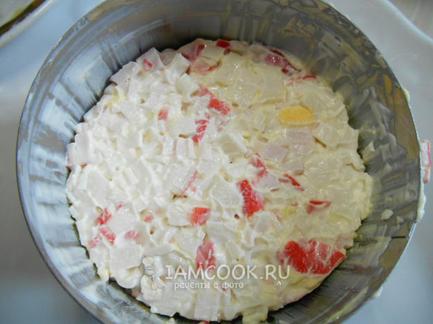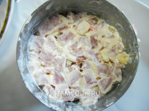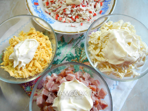 Так же нужно заправить и другие компоненты салата: ветчину, палочки, желтки, сыр.