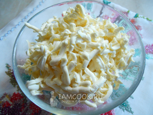 Плавленый сыр тоже пропускаем через тёрку. Его до этого момента стоит держать в холодильнике или 10 минут в морозилке.