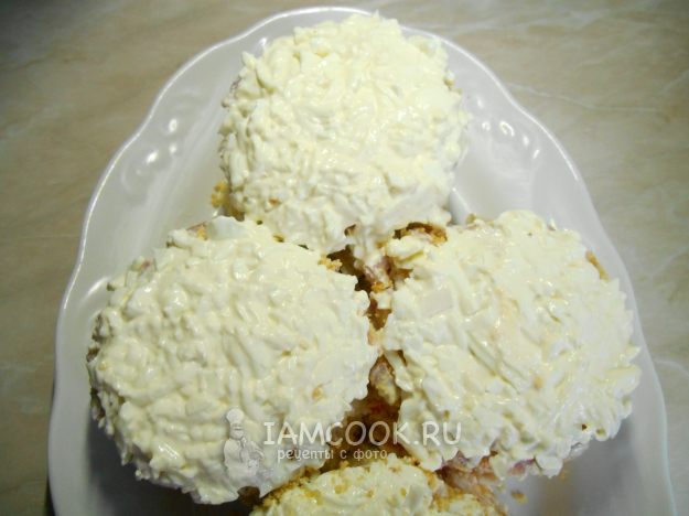 Белки делим на 2 части. Одну оставляем для обсыпки. Её я подкрасила пищевым красителем. Остальное заправляем майонезом.