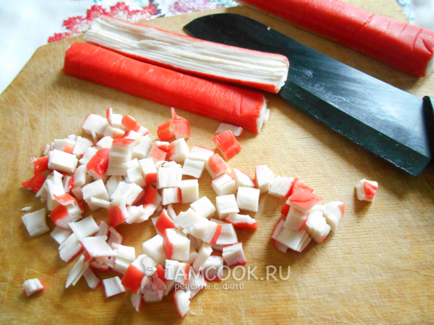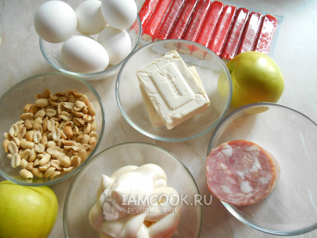 Продукты для салата «Снежная королева» с крабовыми палочками можно увидеть на фото. До начала приготовления нужно отварить яйца вкрутую, разморозить крабовые палочки. Помыть яблоки.