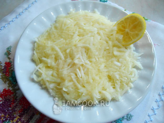 Очищенные яблоки натираем на морковной тёрке. Для большей пикантности, или если попались слишком сладкие плоды, можно сбрызнуть массу соком лимона.