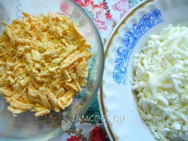 Яйца нужно разделить на белки и желтки. Отдельно натереть на крупной тёрке.