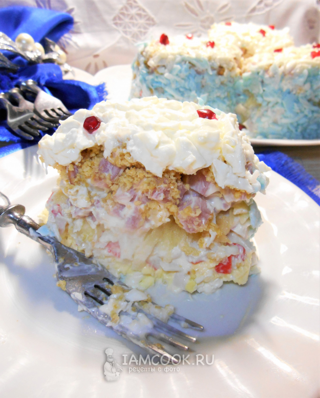 Осталось оформить бока салата оставшимися белками. Украшаем сверху зёрнами граната. Настаиваем салат Снежная королева с крабовыми палочками 2-3 часа в холодном месте. Подаём на стол!
