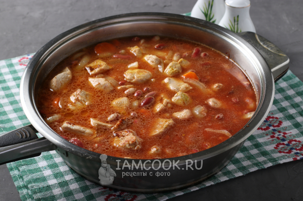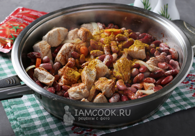 Сковороду накрыть крышкой, убавить огонь и тушить индейку с фасолью 1 час. После этого проверить вилкой фасоль на готовность. Разные сорта фасоли могут вариться больше или меньше. Если фасоль ещё не готова, то продолжать готовить ещё 10-15 минут под крышкой. В самом конце в сковороду добавить измельчённый чеснок, перемешать и оставить блюдо настояться 15-20 минут.
