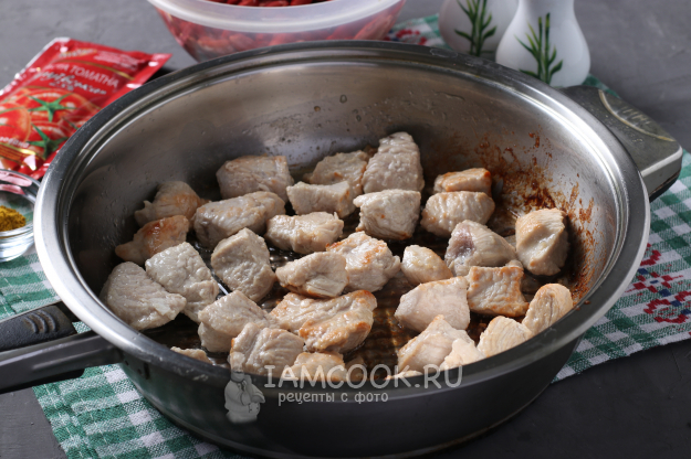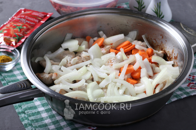 Добавить к индейке лук с морковью, обжарить немного всё вместе.