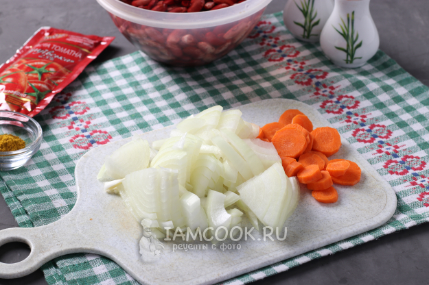 Фасоль заливаем водой на ночь, она хорошо разбухнет и увеличится в размере.