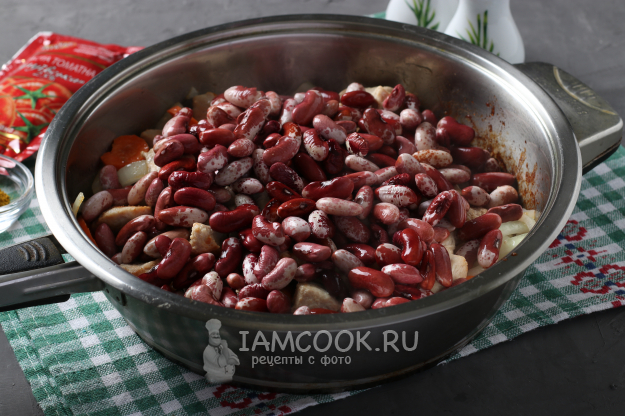 Набухшую фасоль тщательно промыть проточной водой и добавить в сковороду.