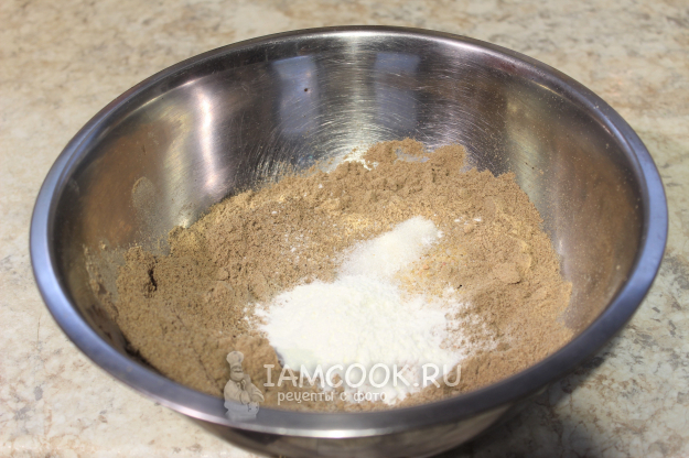 В сухой миске соединяем сухие ингредиенты - муку из льна, сахар, соль и разрыхлитель (можно соду).