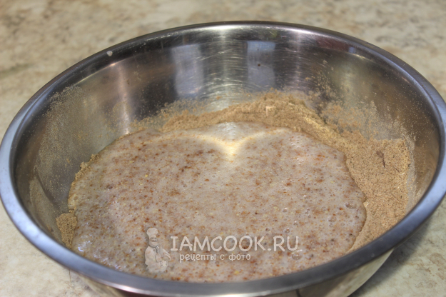Муку перемешиваем, делаем небольшое углубление, туда выливаем смесь из измельчённого льна.