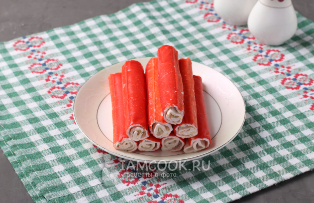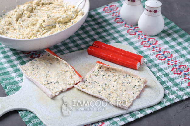 С крабовых палочек снять плёнку. Аккуратно развернуть палочки и смазать подготовленной начинкой.
