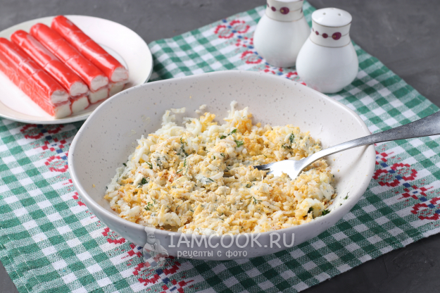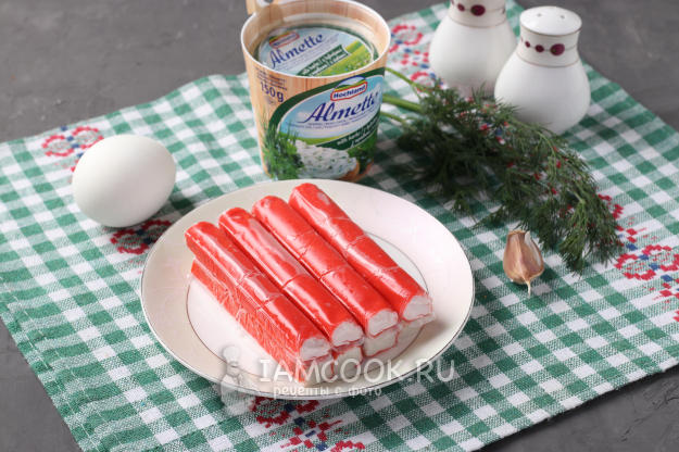 Для приготовления закуски из крабовых палочек, фаршированных сыром, яйцом и чесноком, подготовить из списка необходимые ингредиенты. Яйцо нужно сварить в течение 10 минут, остудить и очистить от скорлупы.