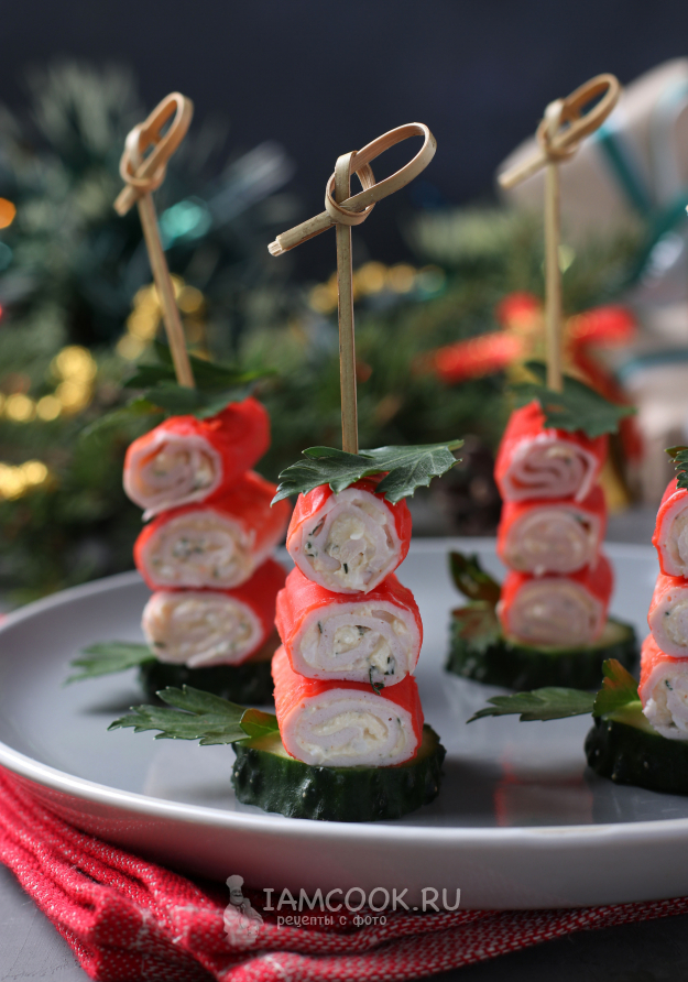 По желанию крабовые палочки, фаршированные сыром, яйцом и чесноком, можно разрезать и сделать из них канапе.
