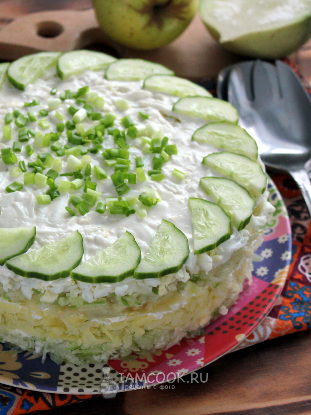 Дайте салату около часа постоять, затем снимите с него кольцо, если оно было)) и украсьте по своему вкусу, например, свежей зеленью или огурцом. При подаче предложите соль по вкусу, т.к. в процессе приготовления солили только слой из картофеля. Сырые овощи (тут - редька и огурец) лучше заранее не солить, а то выделят слишком много сока (потекут).