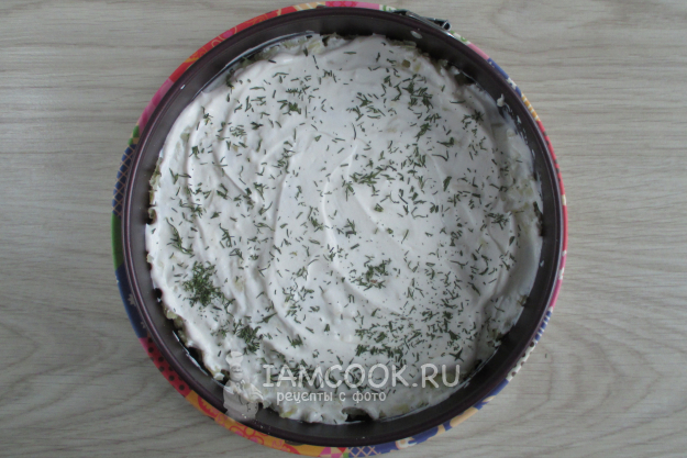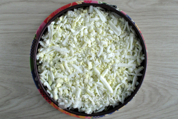 Последний слой - тёртое яйцо, и поверх него - майонез (сеточка или равномерный слой).