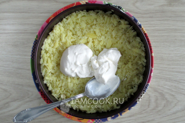 Затем разместите слой тёртого картофеля и хорошо смажьте его сметаной. Слегка посолите.
