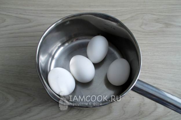 Яйца требуется приготовить вкрутую. Например, после закипания варить их около 10 минут на среднем или слабом кипении под крышкой, потом поместить в холодную проточную воду, а затем очистить.