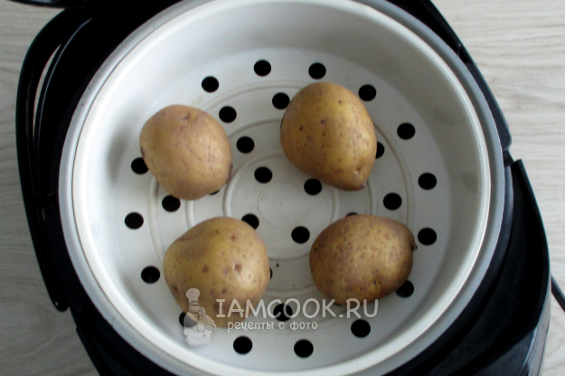 Заранее сварите картофель в мундире, мне для салатов нравится - на пару. Например, в мультиварке около 25 минут (время зависит от размера картофелин). Можно и купить готовый картофель в кулинарии... Остывший картофель очистите от кожуры.