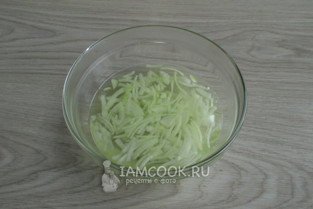 Нашинкуйте лук, и если он очень резкий на вкус, то залейте его кипятком минут на пять.