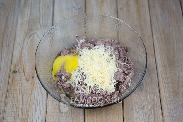 Фасолевую массу выложим в миску, туда же добавим сыр, натертый на мелкой терке, и вобьем яйцо. Посолим.