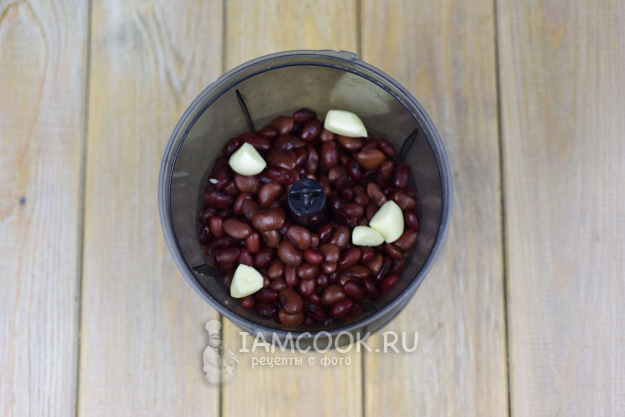 Отваренную фасоль выложим в чашу стационарного блендера, туда же выложим очищенные зубчики чеснока.