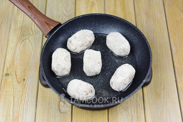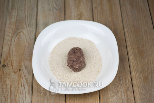 Чуть увлажнив руки, приступим к формированию заготовок котлет. Каждую заготовку-котлетку обваляем со всех сторон в панировочных сухарях.