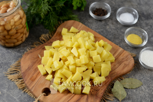 Дальше нарежьте картофель мелким кубиком, переложите в кастрюлю к мясу.