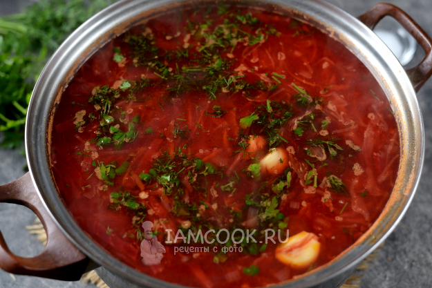 Спустя время попробуйте борщ: если кислота хорошо отрегулирована по вашему вкусу, положите нарезанную свежую зелень и выключите плиту. Оставьте борщ под крышкой минут на 15 настояться.