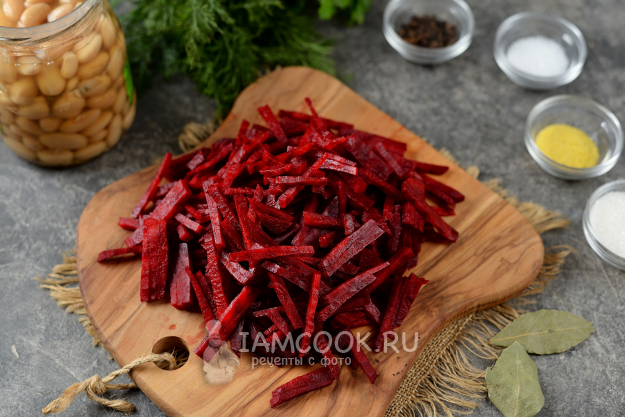 Пока капуста варится, нарежьте свеклу тонкой соломкой, не ленитесь - чем тоньше нарежете, тем быстрее она сварится.