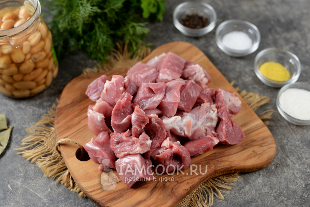 Вскипятите в кастрюле чуть больше половины воды, нарежьте свинину средними кусками, выложите в кипяток вместе с мелко нарезанным репчатым луком. Варите мясо минут 20-25, не забудьте собрать пену.