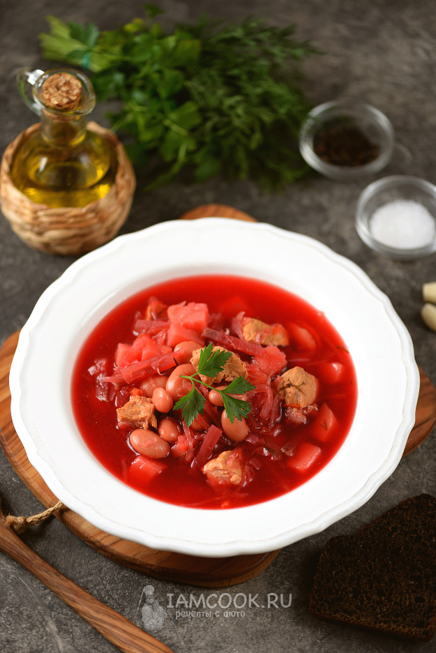 Добавьте свеклу, фасоль и томатную пасту одновременно в кастрюлю. Варите на тихом огне минут 10-15, ломтики свеклы должны остаться чуть хрустящими. Посолите и поперчите бульон по вкусу, добавьте приправу и сахар обязательно, поскольку борщ получится достаточно кислым от капусты и томатной пасты. В процессе положите раздавленные зубчики чеснока, гвоздику и лавровый лист.