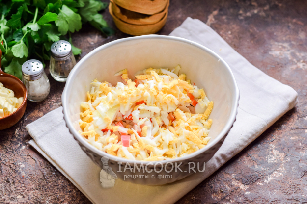 Куриные яйца лучше натереть на средней терке, но также можно и нарезать, только как можно более мелкими кусочками. Добавить яйца в салатник к палочкам.