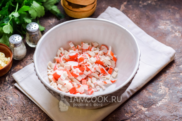Нарезать крабовые палочки мелкими кусочками, переложить в глубокую миску, в которой будет удобно перемешивать все ингредиенты.
