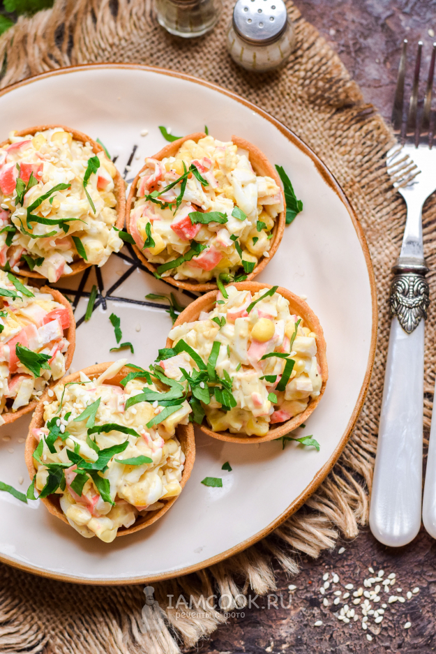 Наполнить тарталетки приготовленным салатом, подавать к столу сразу же. Если тарталетки с крабовыми палочками и кукурузой будут долго стоять, они могут размокнуть и не будут так приятно хрустеть.