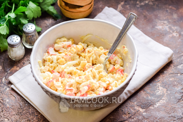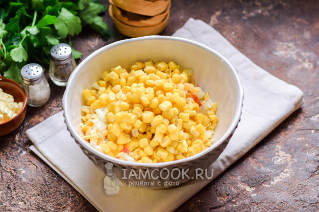 Следом добавить в салат сладкую консервированную кукурузу.