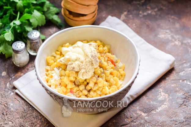 Заправить ингредиенты майонезом. Соль и перец добавить по своему вкусу.