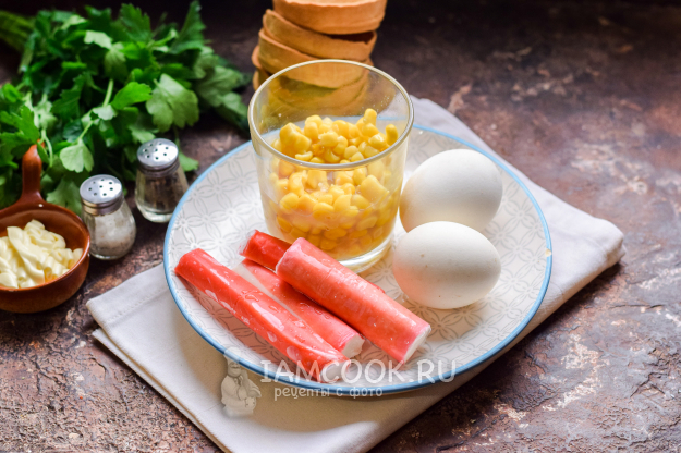 Подготовить все необходимые продукты для тарталеток с крабовыми палочками, яйцом и кукурузой по списку. Заранее отварить куриные яйца - 10 минут в подсоленной воде. Яйца остудить и почистить. Крабовые палочки заранее достать из морозильной камеры. Консервированную кукурузу открыть, сок слить.