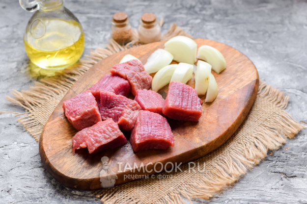 Говядину ополоснуть, промокнуть кухонными бумажными полотенцами. Нарезать мясо крупными кусками. Лук очистить и крупно нарезать.