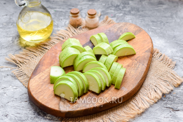 Сразу можно разогреть духовку, установить температуру 180 градусов. Кабачок выбрать крупный, ополоснуть и просушить. После нарезать кабачок средними по размеру дольками.