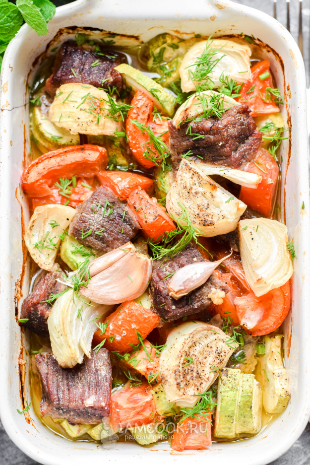 Запекать говядину с кабачками и помидорами в духовке 55-60 минут. Спустя время подавать мясо и овощи к столу.