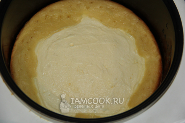 Затем столовой ложкой, начиная с середины, выкладываем творожную начинку. Закрыть крышку мультиварки и включить режим "Выпечка". Время выпекания ленивой ватрушки с творогом в мультиварке - 60 минут. По звуковому сигналу открыть крышку, если творожная начинка сверху будет сырая, то включить еще на минут 10-15.