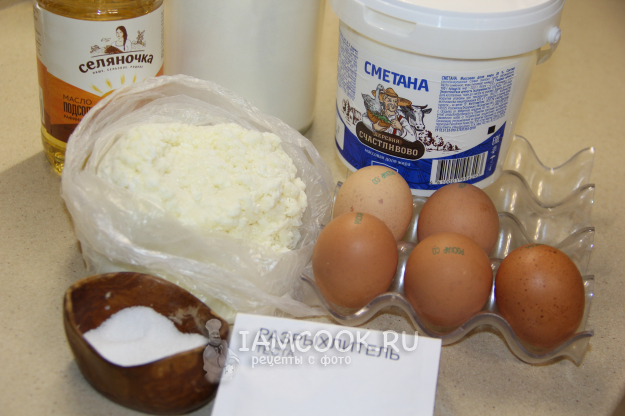 Возьмите продукты для приготовления ленивой ватрушки с творогом в мультиварке.