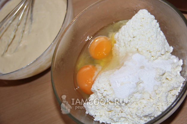 Отставить тесто в сторону и приготовить начинку. Соединить творог, у меня 5%, яйца и сахарную пудру.