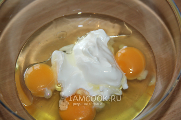 Для начала приготовить тесто. В миску вбить яйца, добавить сметану и растительное масло. Я использовала сметану 15% жирности.